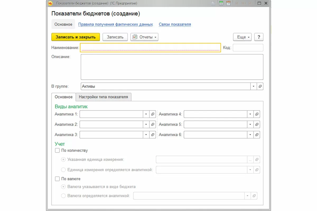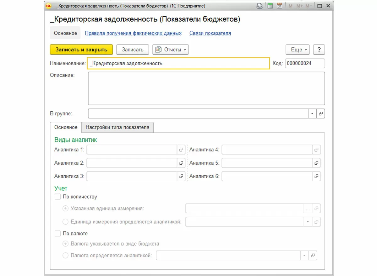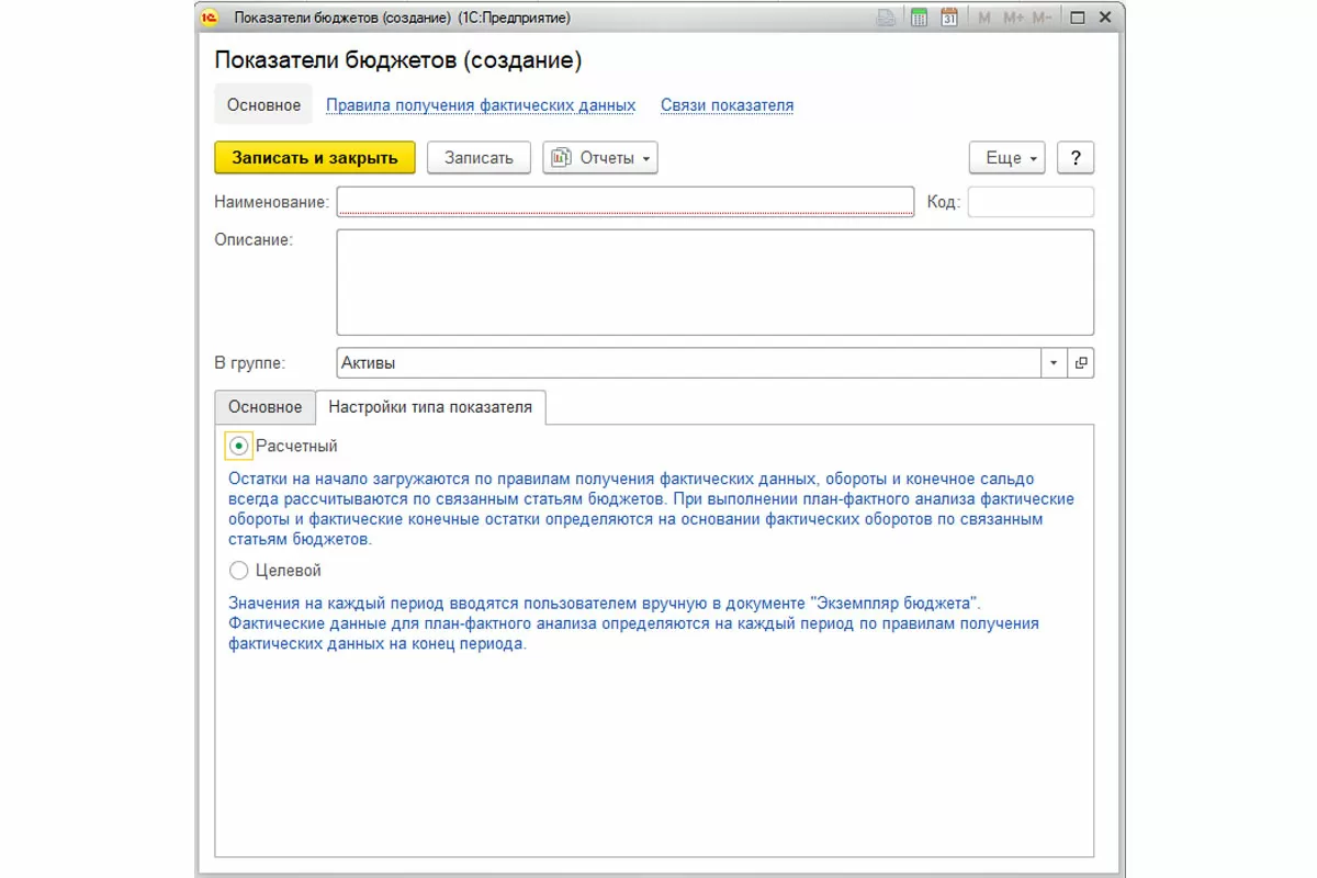 Показатели бюджетов – расчетные значения, используемые для формирования прогнозного баланса. Они формируются на основании суммы фактических остатков и запланированных оборотов по статьям бюджетов. Сам элемент справочника Показатели бюджетов по структуре очень похож на элемент справочника Статьи бюджетов. Принципиальная разница – возможность выбора типа показателя.