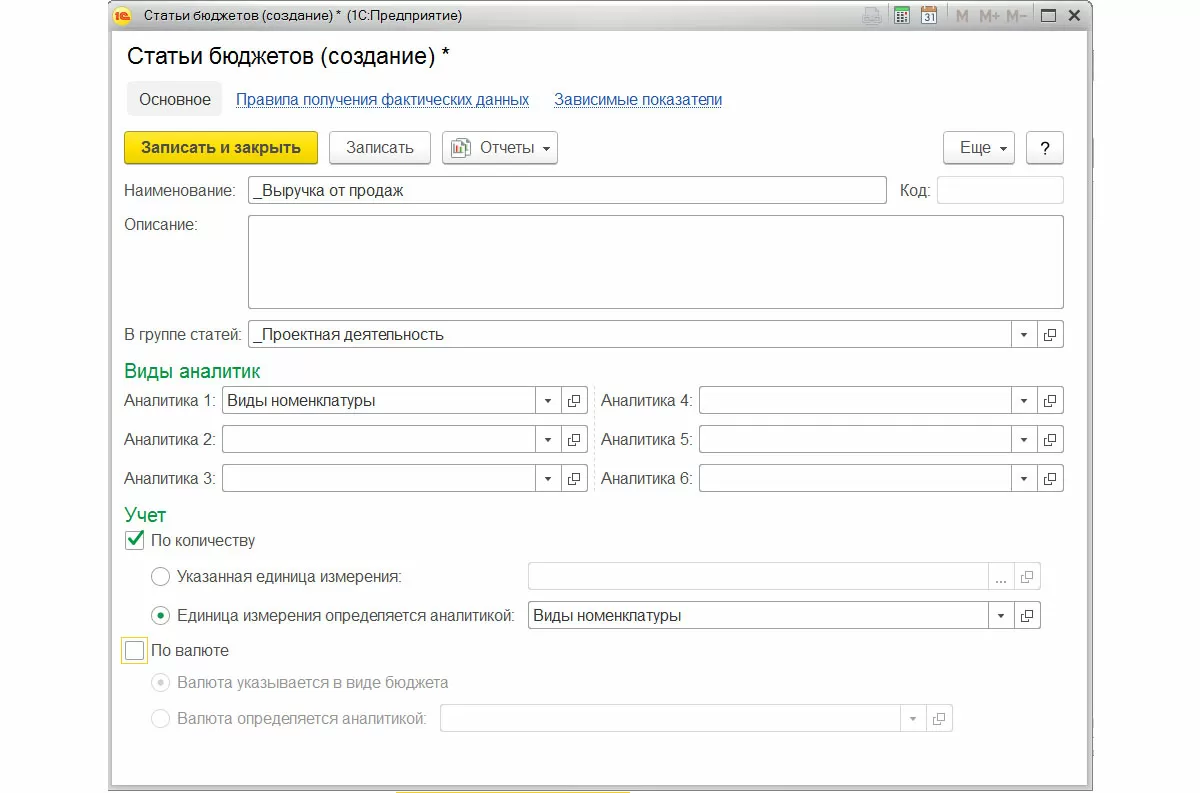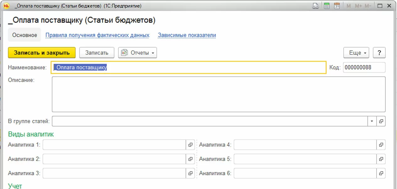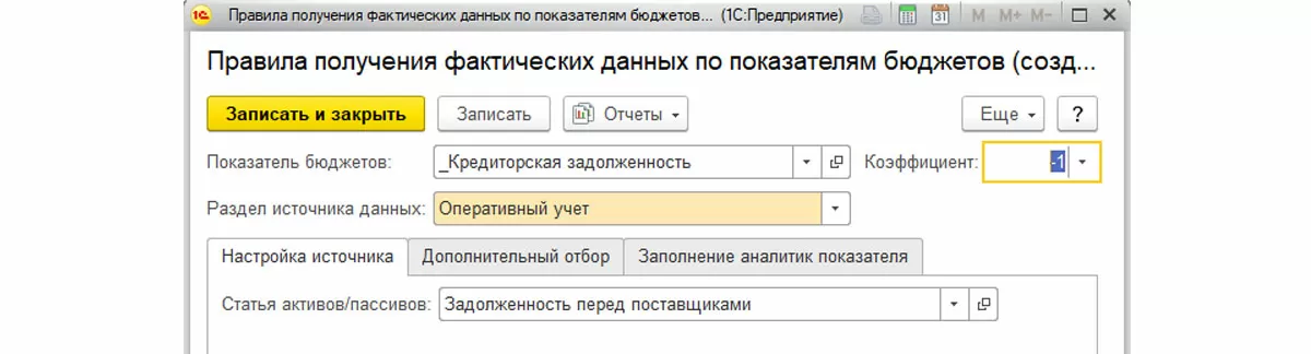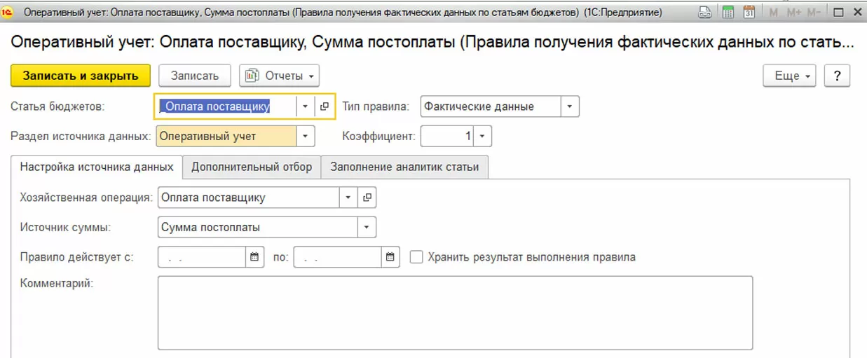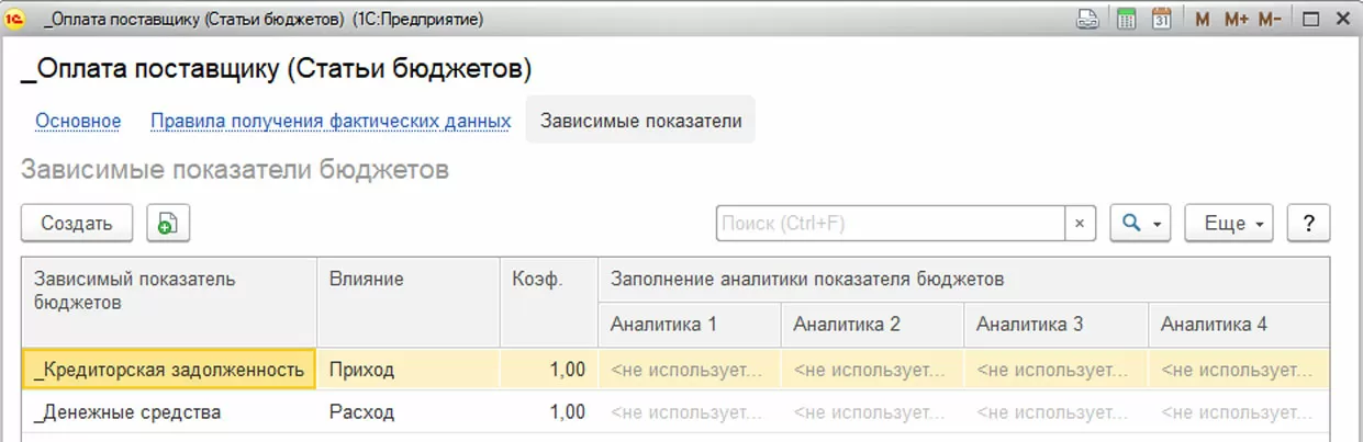 Имеет смысл настроить для статьи бюджетов правила получения фактических данных и зависимые показатели. Правила получения фактических данных позволяют проводить план-фактный анализ в разрезе заполняемой статьи, а также осуществлять контроль за фактически израсходованными денежными средствами.
