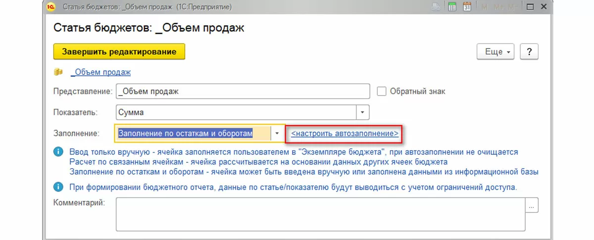 В данном случае потребуется заполнение правил получения данных. Для этого нажимаем дважды на статью в структуре бюджета и в открывшейся форме выбираем значение поля Заполнение «Заполнение по остаткам и оборотам». Нажимаем на ссылку «Настроить автозаполнение».