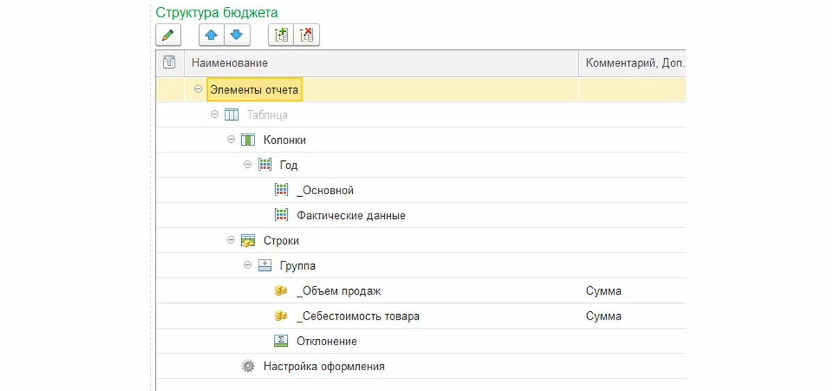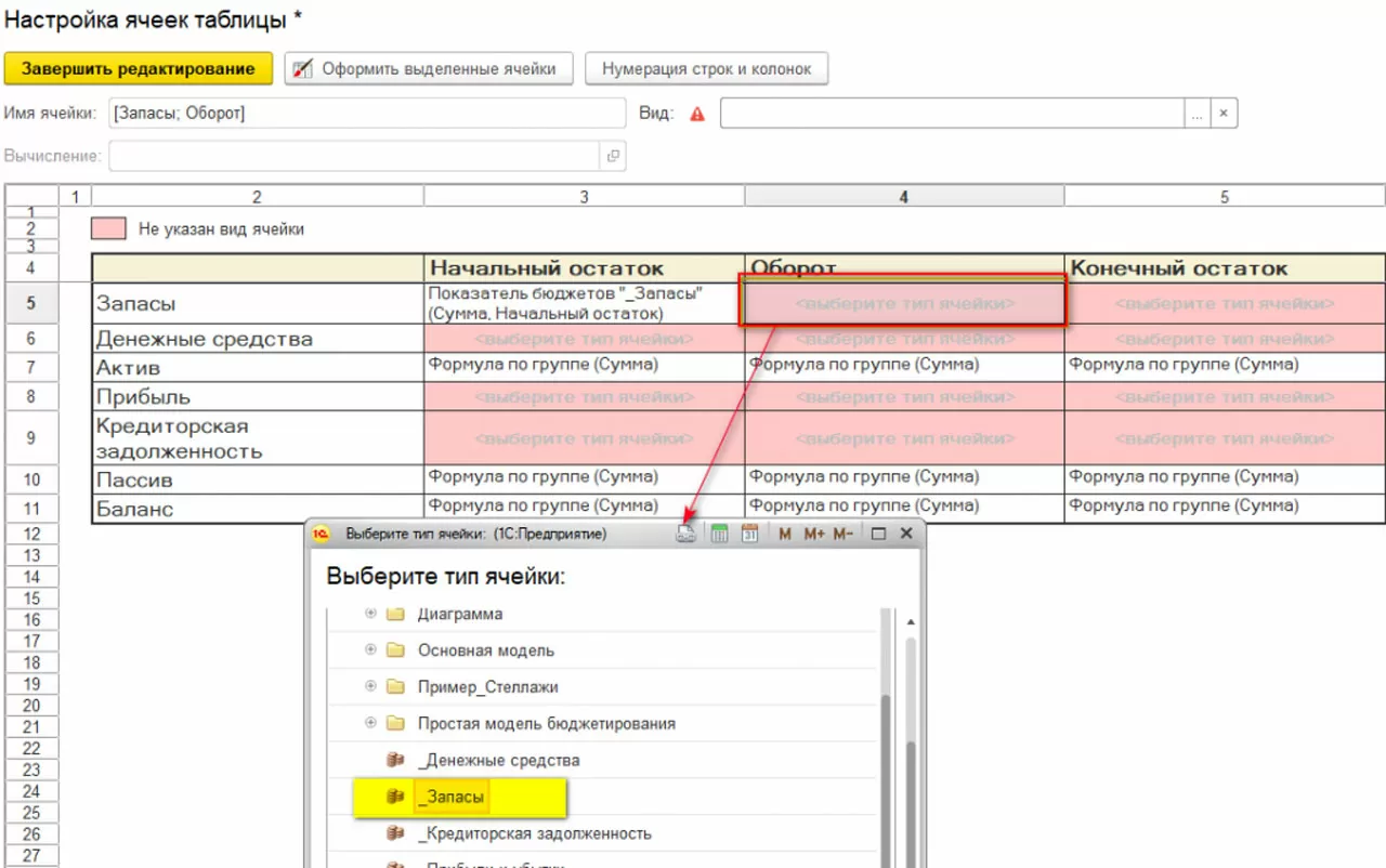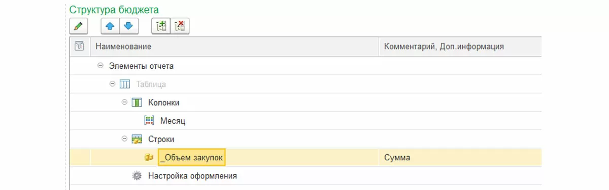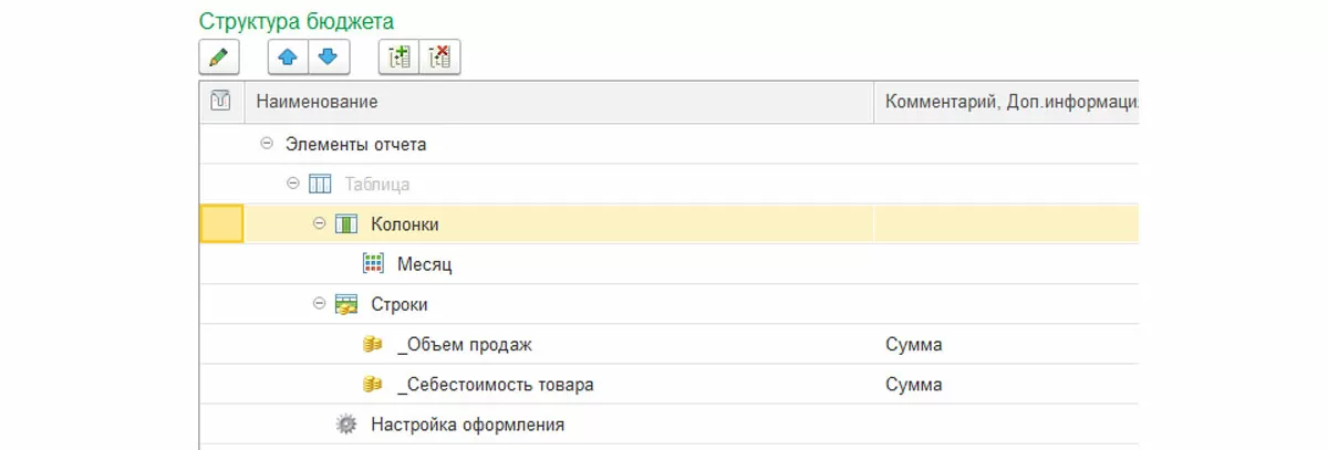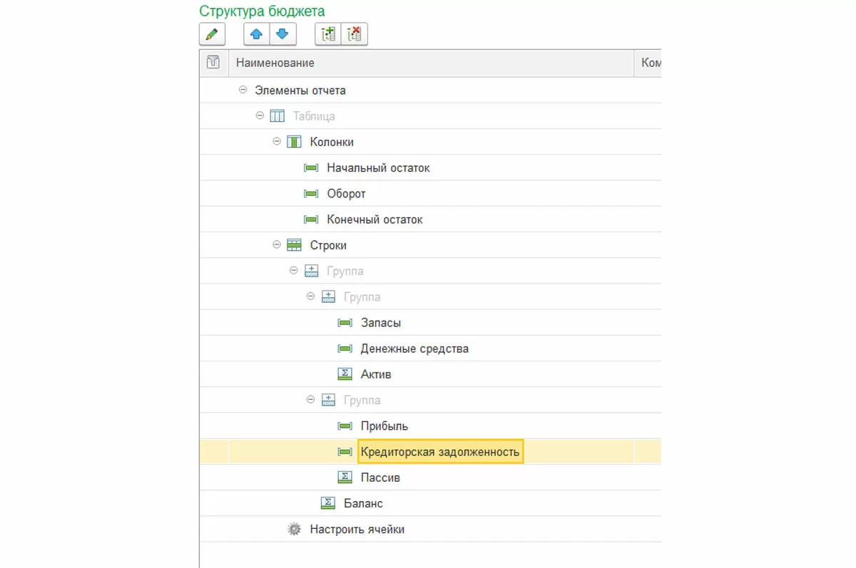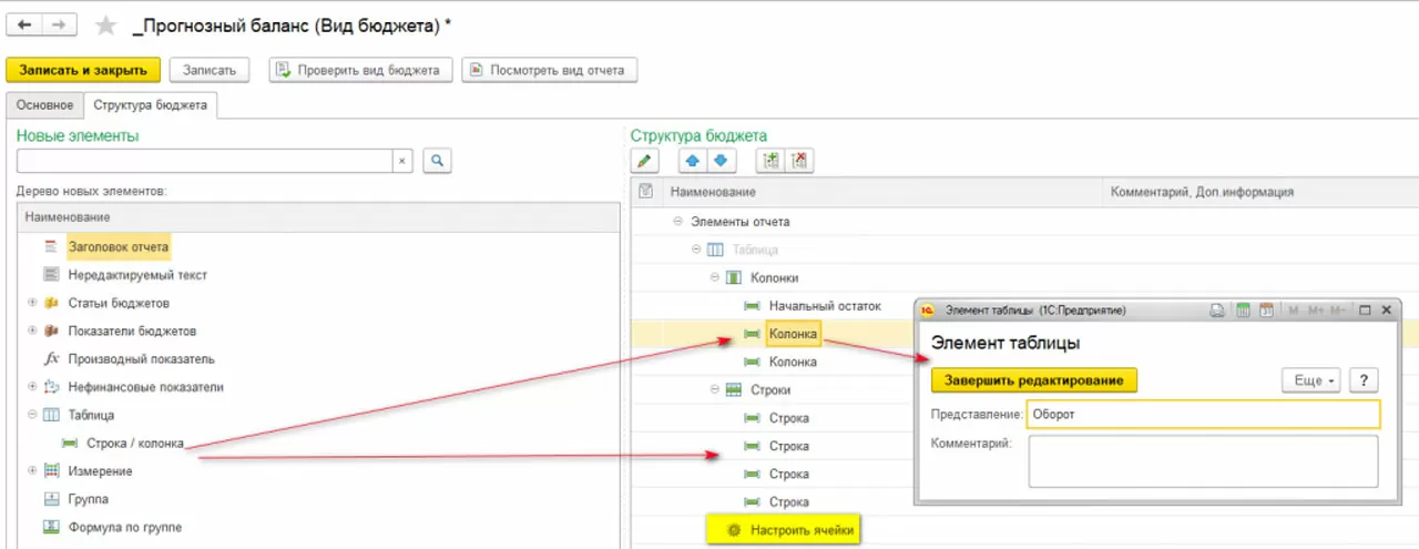 В данном виде бюджета мы не можем «перетащить» статью или показатель бюджетов. При работе со сложной таблицей, для начала, необходимо заполнить необходимое количество строк и колонок в структуре, далее дать названия всем элементам, после чего перейти по ссылке «Настроить ячейки» где и будет определяться правило заполнения таблицы.