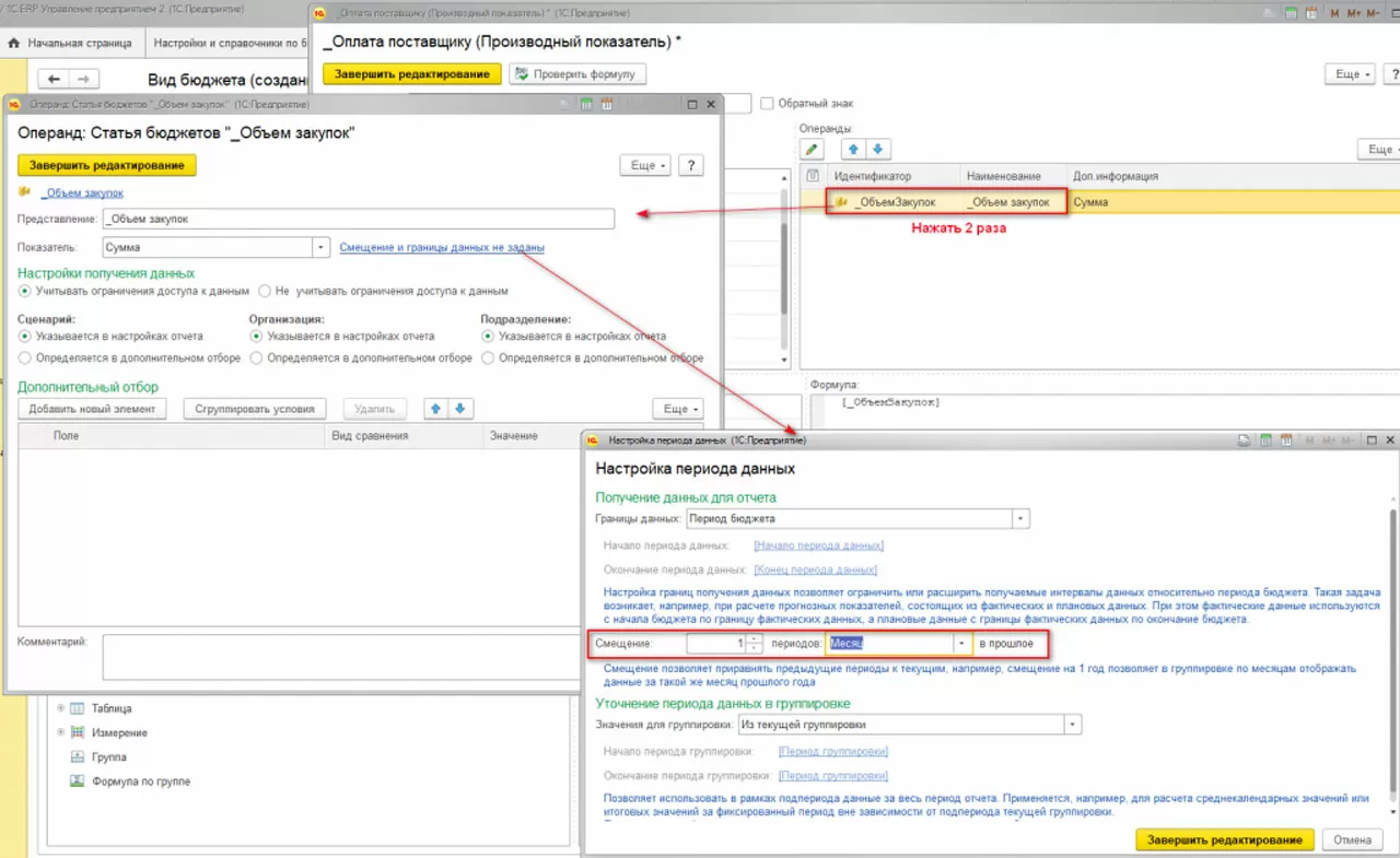 Для выполнения данного условия необходимо нажать дважды на Операнд, после чего откроется карточка Операнда. По ссылке «Смещение и границы данных не заданы» откроется окно настройки периода данных, в котором и необходимо указать смещение на 1 месяц.