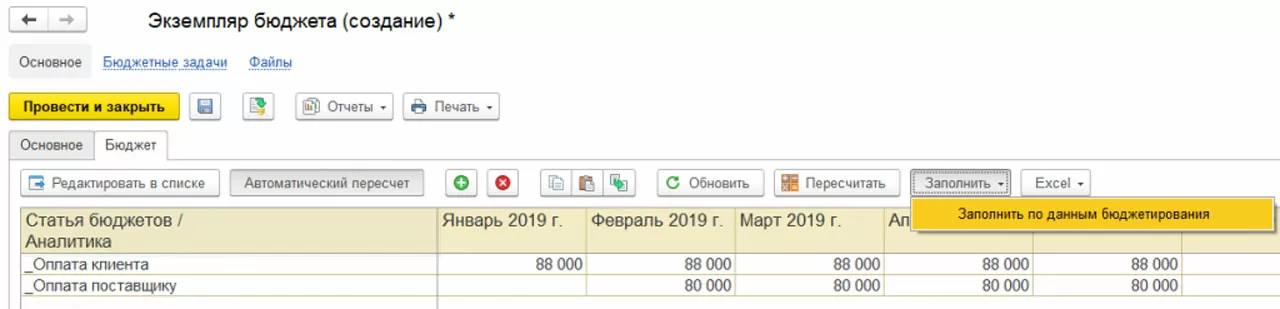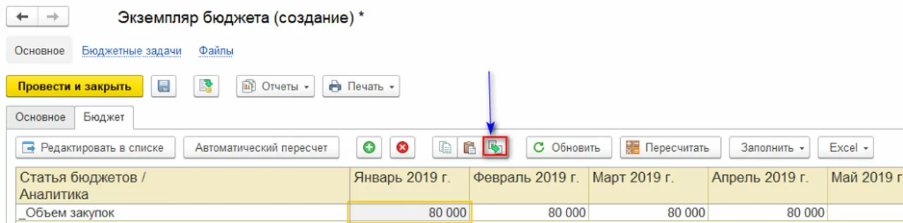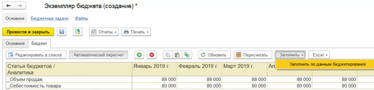 В данном случае в экземпляре бюджета можно воспользоваться кнопкой «Заполнить».