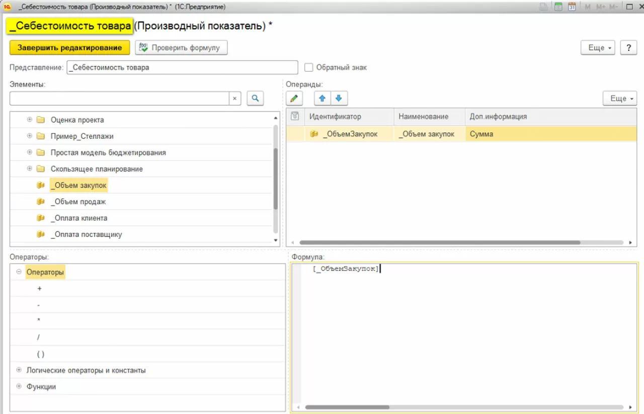 Если для разного вида товара используется разный процент наценки, целесообразно использовать Нефинансовый показатель (аналитика – вид номенклатуры или номенклатура), тогда формула расчета объема продаж выглядела бы так: [Объем закупок] * (1+ [Нефинансовый показатель]). Сохраняем вид бюджета, проверяем его и создаем экземпляр бюджета.