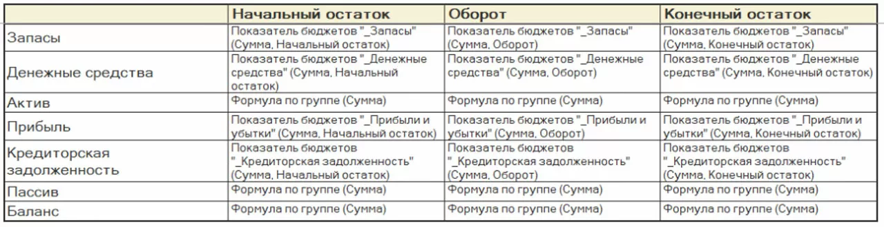 - Прогнозный баланс (отчет, сложная таблица, показатели бюджетов).