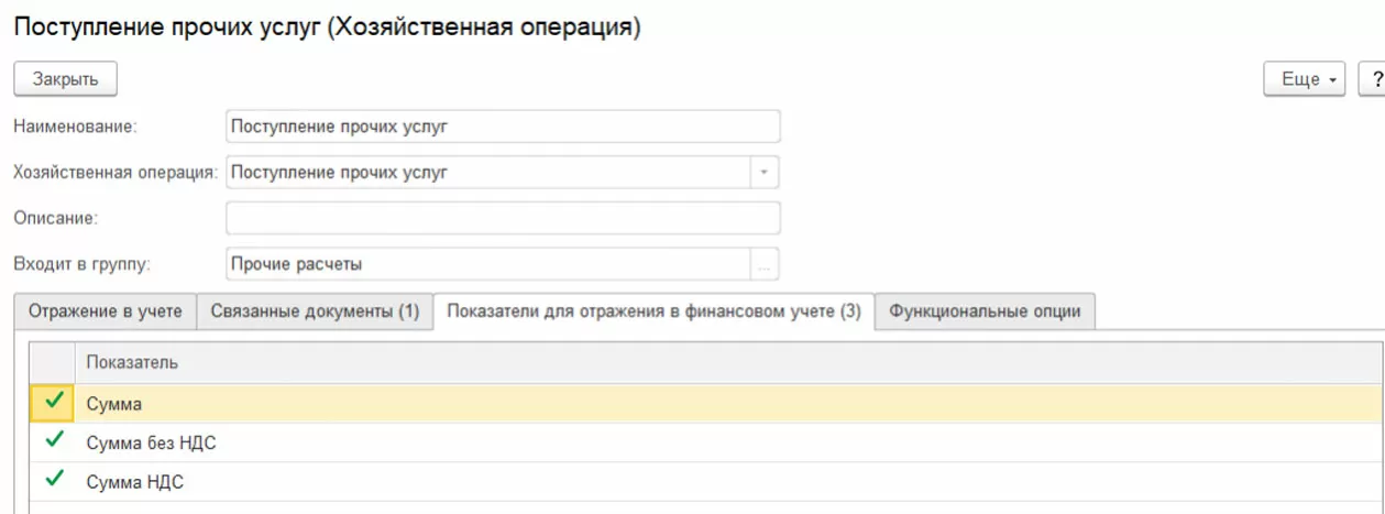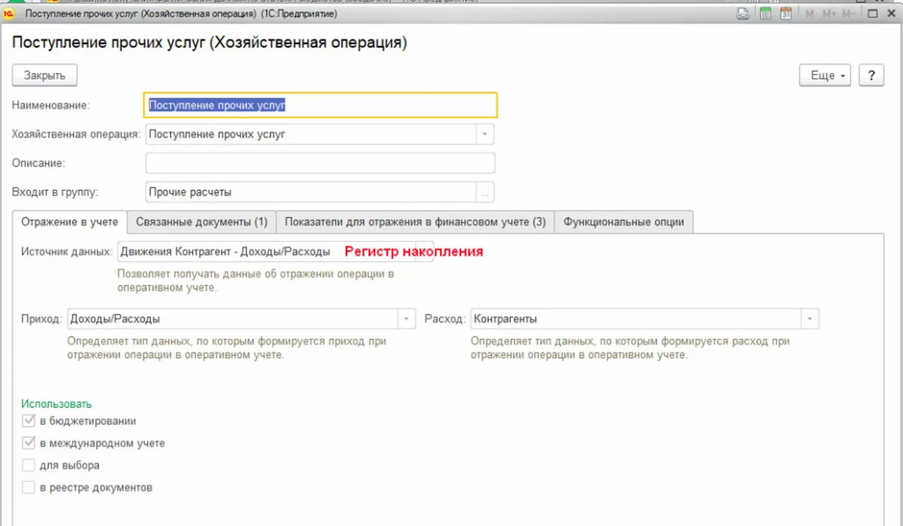 Открыв хозяйственную операцию, можно получить некоторые подсказки о получаемых данных, например: регистр, из которого будут получены данные, и аналитика данного регистра; Документы, формирующие движения по указанному регистру, и возможные для выбора показатели.