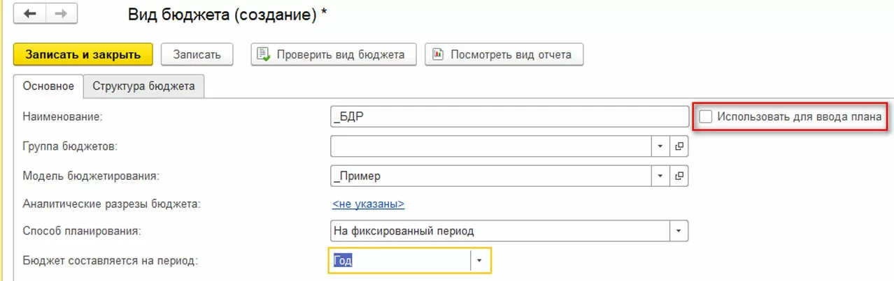 В рамках рассматриваемого примера мастер-бюджеты формируются сводно – за год. БДР содержит как плановые, так и фактические данные. Для данного вида бюджета при формировании вида бюджета необходимо снять галку «Использовать для ввода плана», так как данный бюджет является только отчетом, а новые данные он не регистрирует. По той же причине нам не требуется настройка ввода данных по статьям.