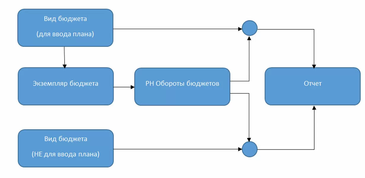 Для начала давайте разберемся в схеме работы. В системе имеется регистр накопления Обороты бюджетов, на основании которого строятся бюджетные отчеты. Для заполнения данного регистра необходимо создать Экземпляр бюджета на основании вида бюджета, используемого для ввода плана. При этом схема выглядит так: