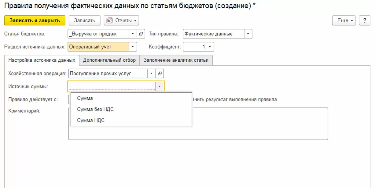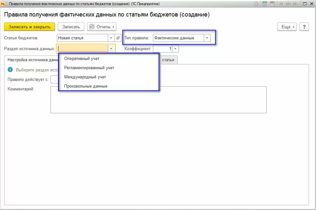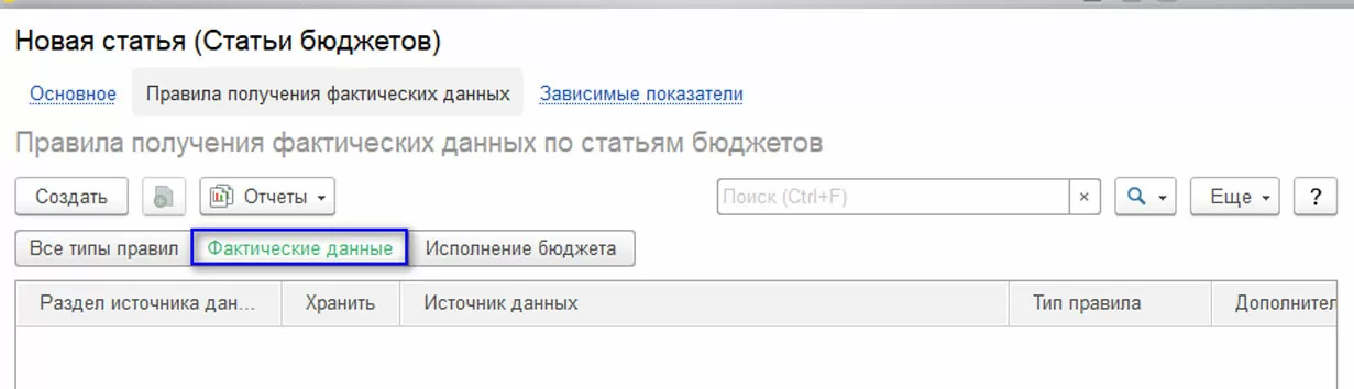 Для формирования план-фактного анализа по статье необходимо создать правило с типом «Фактические данные». Для начала определим источник данных для правила: