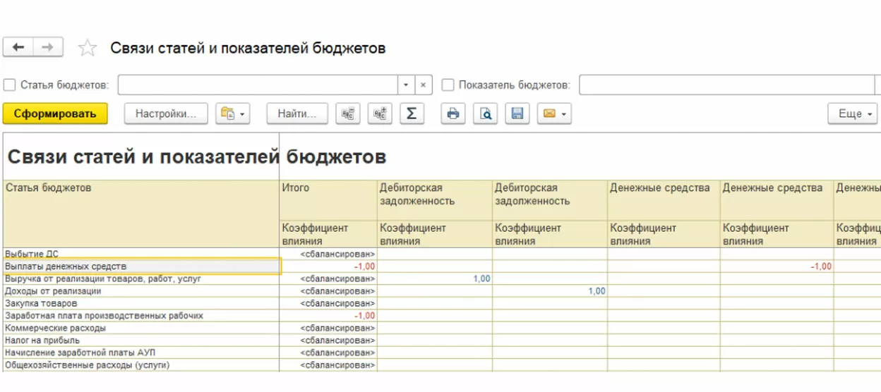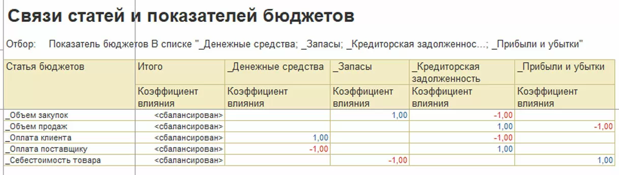После заполнения связей статей и показателей бюджетов стоит воспользоваться одноименным отчетом для контроля корректности заполнения справочника. Значение колонки «Коэффициент влияния должен быть равен значению «Сбалансирован», иначе в прогнозном балансе активы не будут равны пассивам.