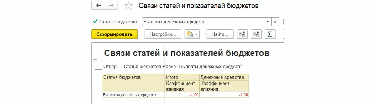 Например, у статьи «Выплаты денежных средств» внесена только одна связь – расход Денежных средств. Очевидно, что необходимо дополнить зависимые показатели для данной статьи бюджета.