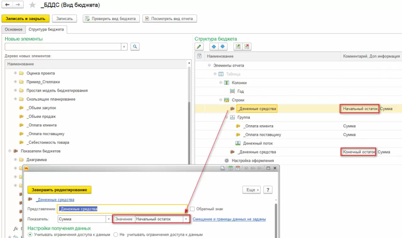 При создании структуры бюджета ДДС учтем, что денежные средства имеют сальдо на начало периода и на конец периода. Для этого необходимо перетащить с поле структуры бюджета показатель Денежные средства дважды и выбрать значение показателя Начальный остаток и Конечный остаток.