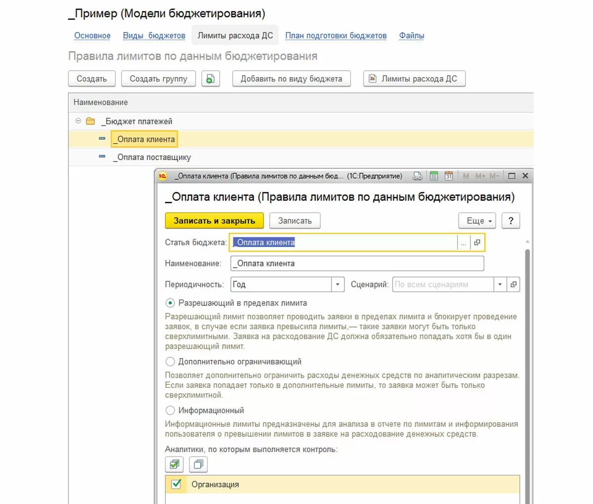 Данная операция может быть выполнена на основании любого вида бюджета, используемого для ввода данных о расходе денежных средств. Лимиты могут быть установлены как для статьи бюджета в общем, так и с детализацией по организациям, подразделениям, партнерам, статьям ДДС и пр.
