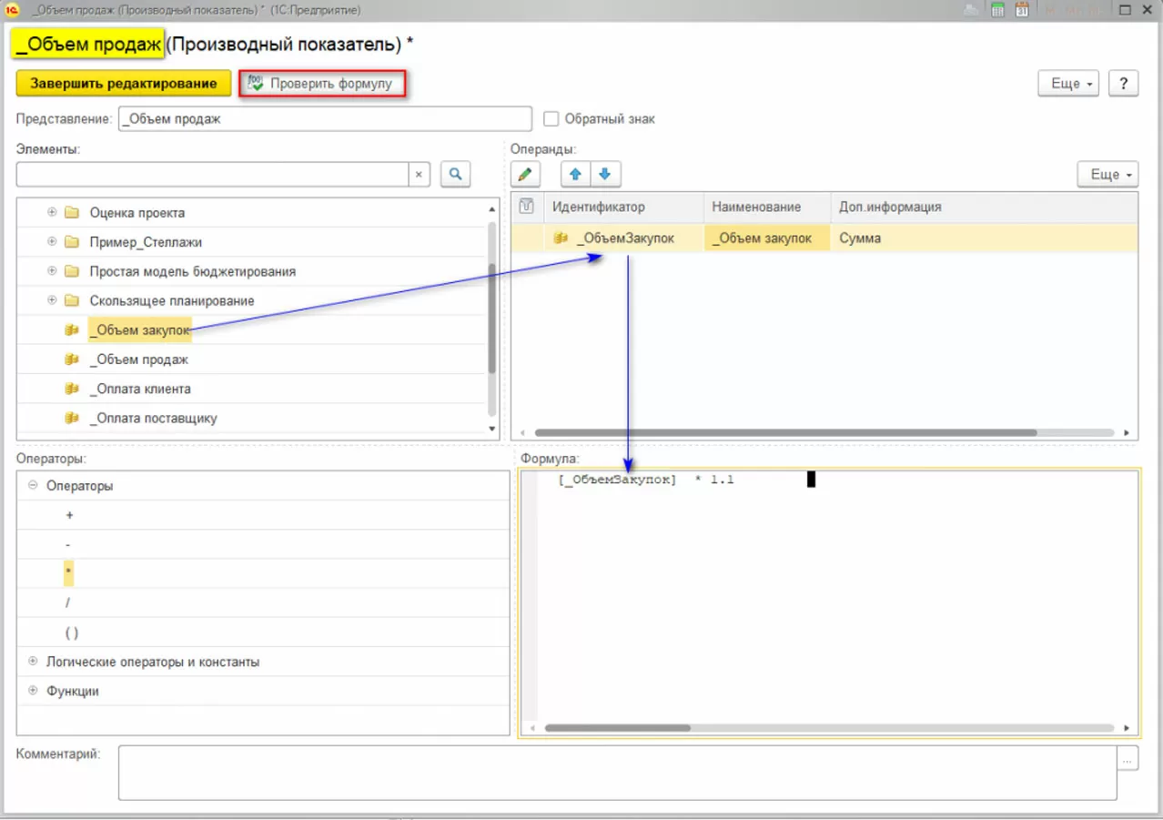 В открывшемся окне заполняем правила получения данных, перед сохранением обязательно проверяем формулу. Неверно заполненная формула не помешает сохранению настройки, но при формировании бюджета данные не будут рассчитаны.