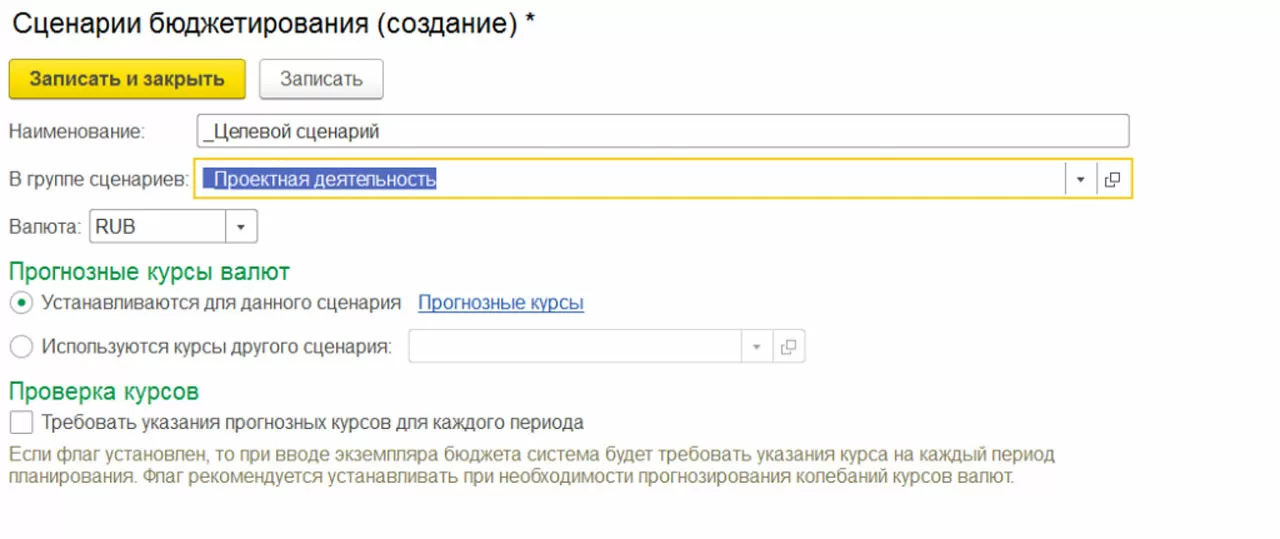 Сценарий бюджетирования – дополнительный разделитель бюджета, позволяющий хранить несколько версий плановых показателей (например, Целевой, Пессимистичный). Сценарий бюджетирования является элементом, в котором определяется валюта бюджета и, при необходимости, Прогнозные курсы.