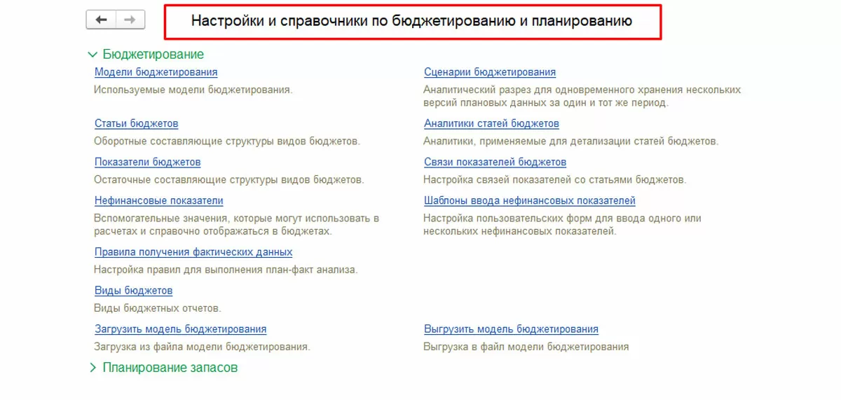 В открывшемся окне настроек можно по ссылкам перейти в справочники, необходимые для работы в подсистеме «Бюджетирование», а также выполнить загрузку и выгрузку модели бюджетирования в файл для обмена с другими информационными базами.