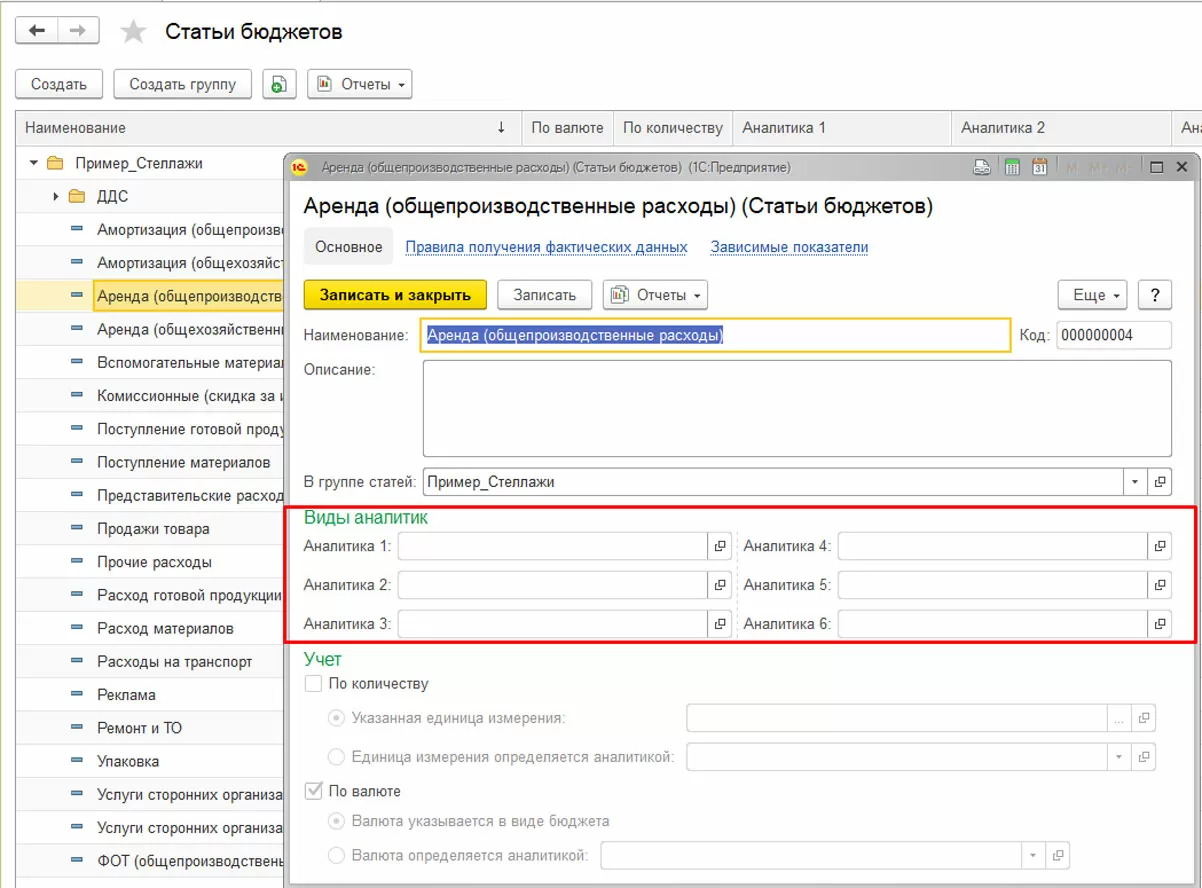 Документ является основным инструментом для установки значений по статьям бюджетов с детализацией до аналитики. По каждой статье пользователи могут самостоятельно настроить до 6 аналитик (например, статью «Выручка» пользователь может детализировать по номенклатуре, видам деятельности, контрагентам и т.д.). Данная настройка выполняется в справочнике «Статьи бюджетов».