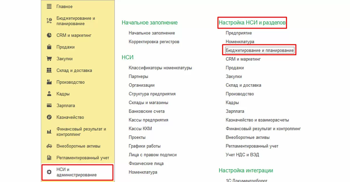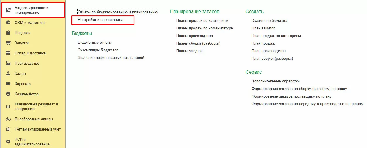 Для доступа к данному разделу в 1С Комплексная автоматизация 2 необходимо выполнить настройку в разделе «НСИ и администрирование-Настройка НСИ и разделов-Бюджетирование и планирование».