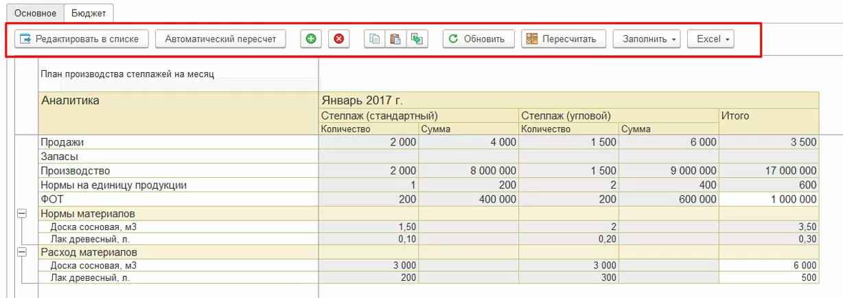 Данные, указанные на закладке «Основное», отображаются на закладке «Бюджет» в виде таблицы, которая может быть отредактирована при помощи кнопок в панели управления.