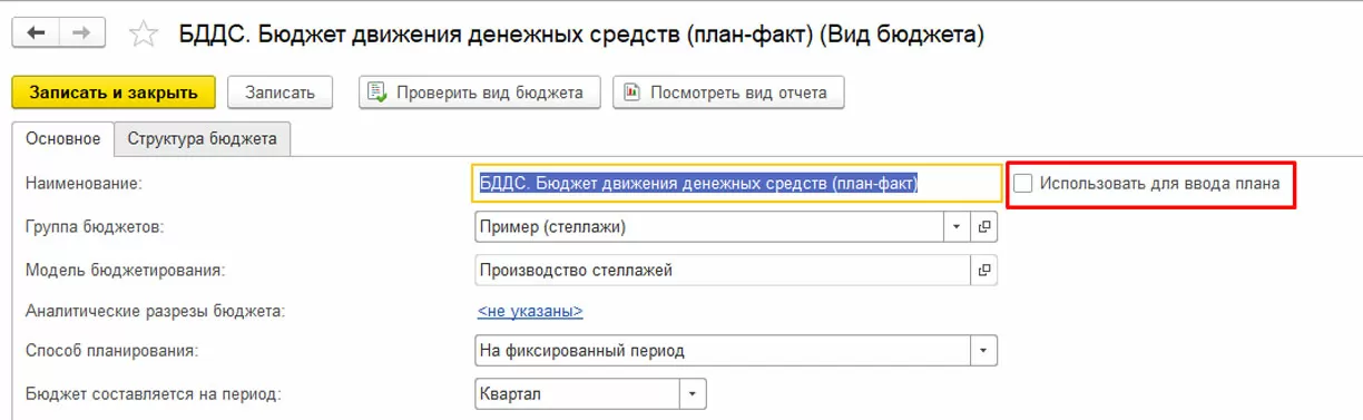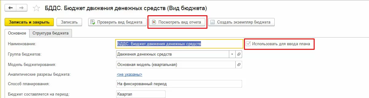 Отборов по сценарию, организации и подразделению может не быть, если они указаны в виде бюджета явным образом. Например, мы настроили «Вид бюджета БДДС» с отметкой «Использовать для ввода плана». Этот вид бюджета будет использоваться и в документе «Экземпляр бюджета», и формироваться в виде бюджетного отчета. Причем, сформировать и отчет, и документ можно сразу из «Вида бюджета».