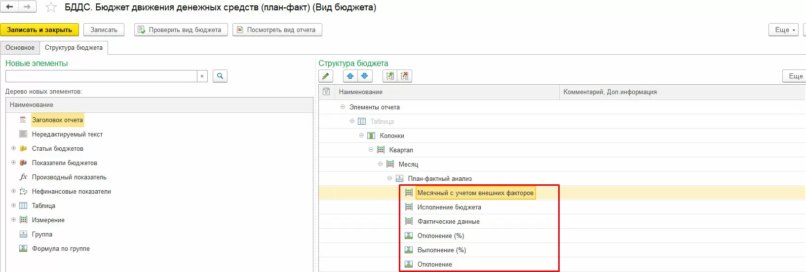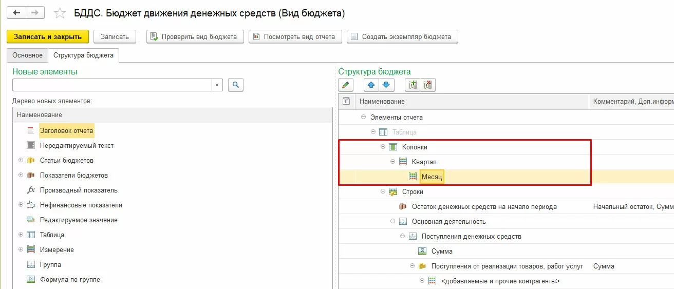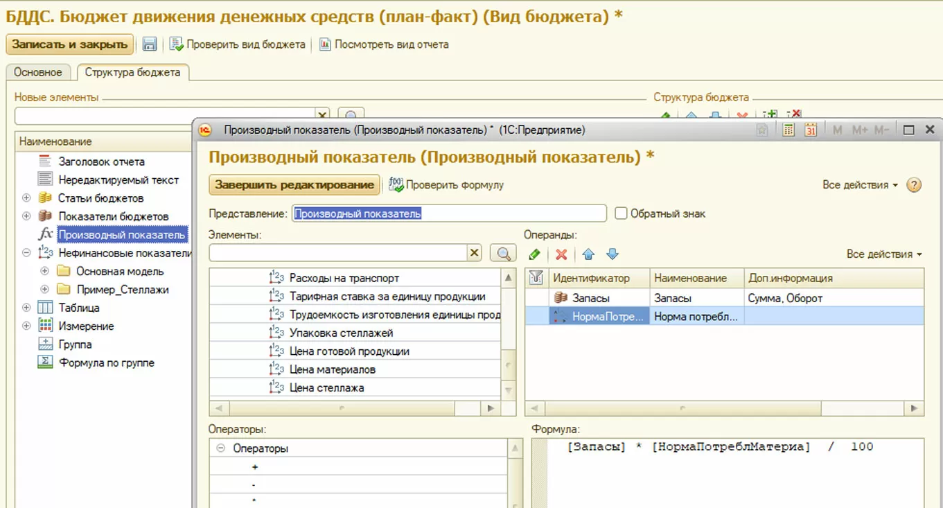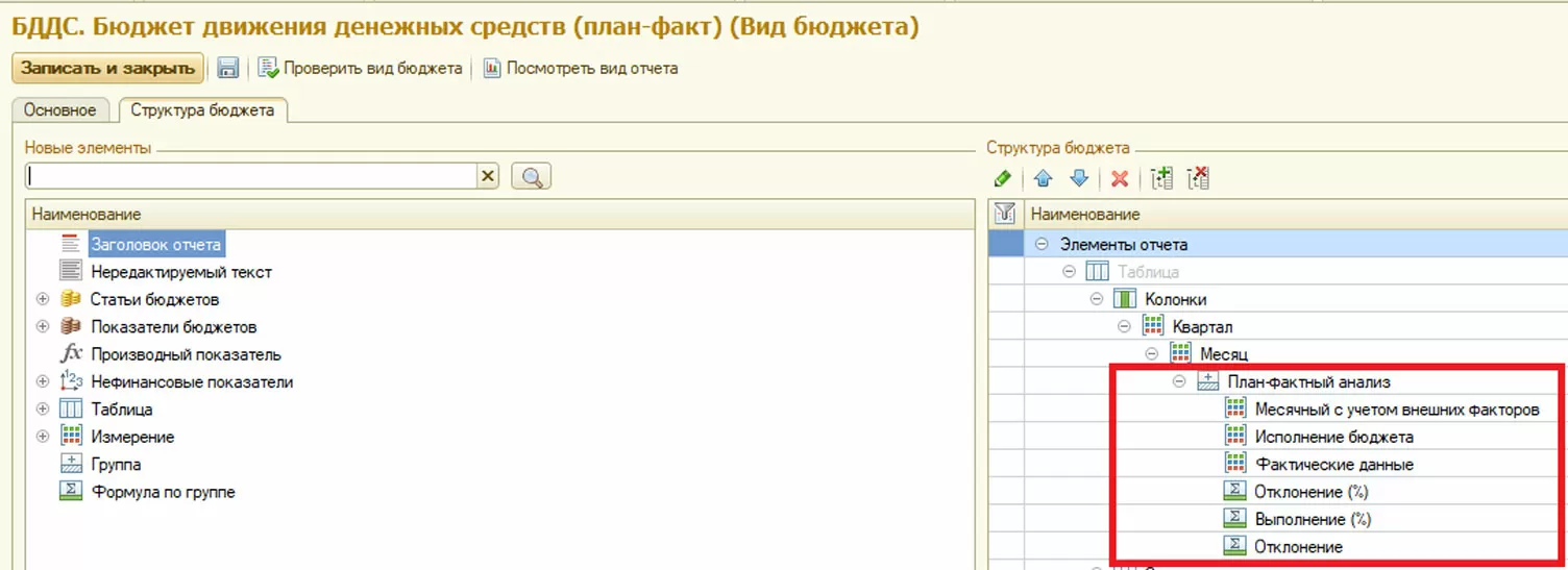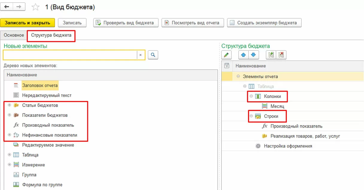 В каждом бюджете (отчете) пользователь определяет состав колонок и строк формы, используемые данные – статьи бюджетов, показатели бюджетов, нефинансовые показатели и производные (расчетные) данные.