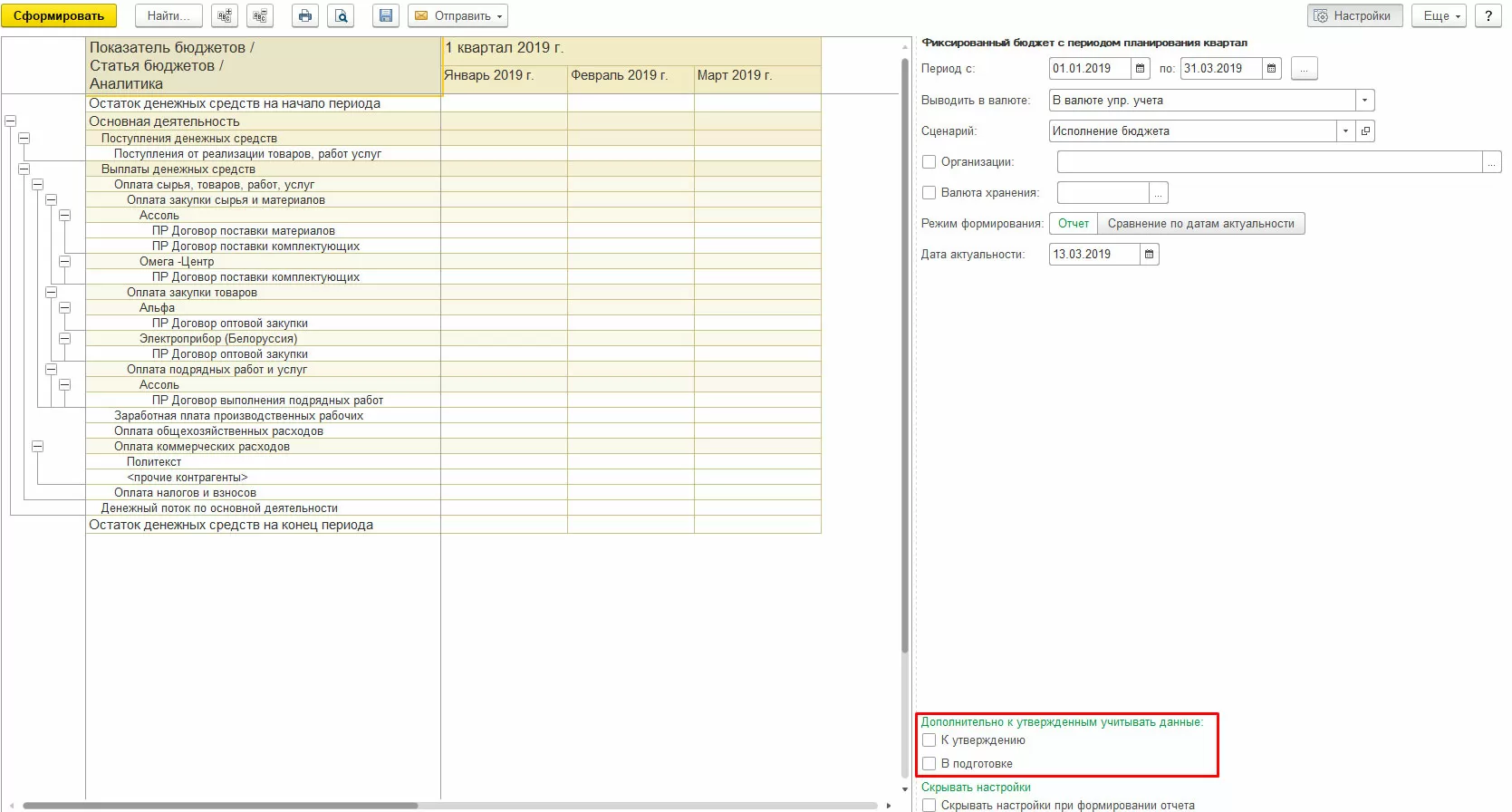 Бюджетный отчет строится по виду бюджета по указанным в настройках отчета периоду, сценарию, организациям и подразделениям.