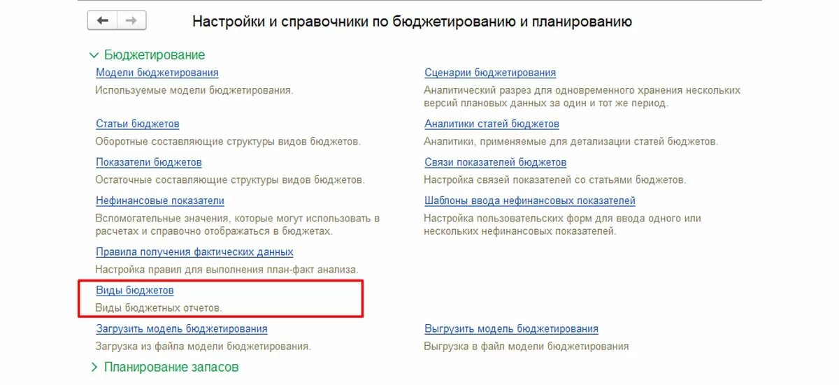 В системе все эти бюджеты описаны и хранятся в справочнике «Виды бюджетов», раздел «Бюджетирование и планирование-Настройки справочников-Виды бюджетов», а также доступны по ссылке в элементах справочника «Модели бюджетирования» (закладка «Виды бюджетов»).