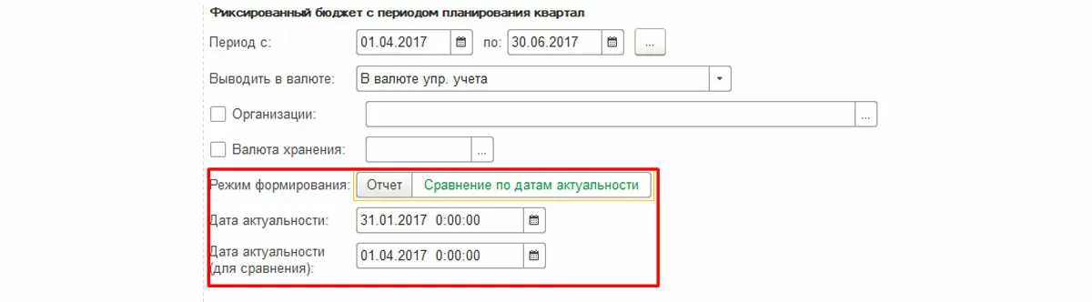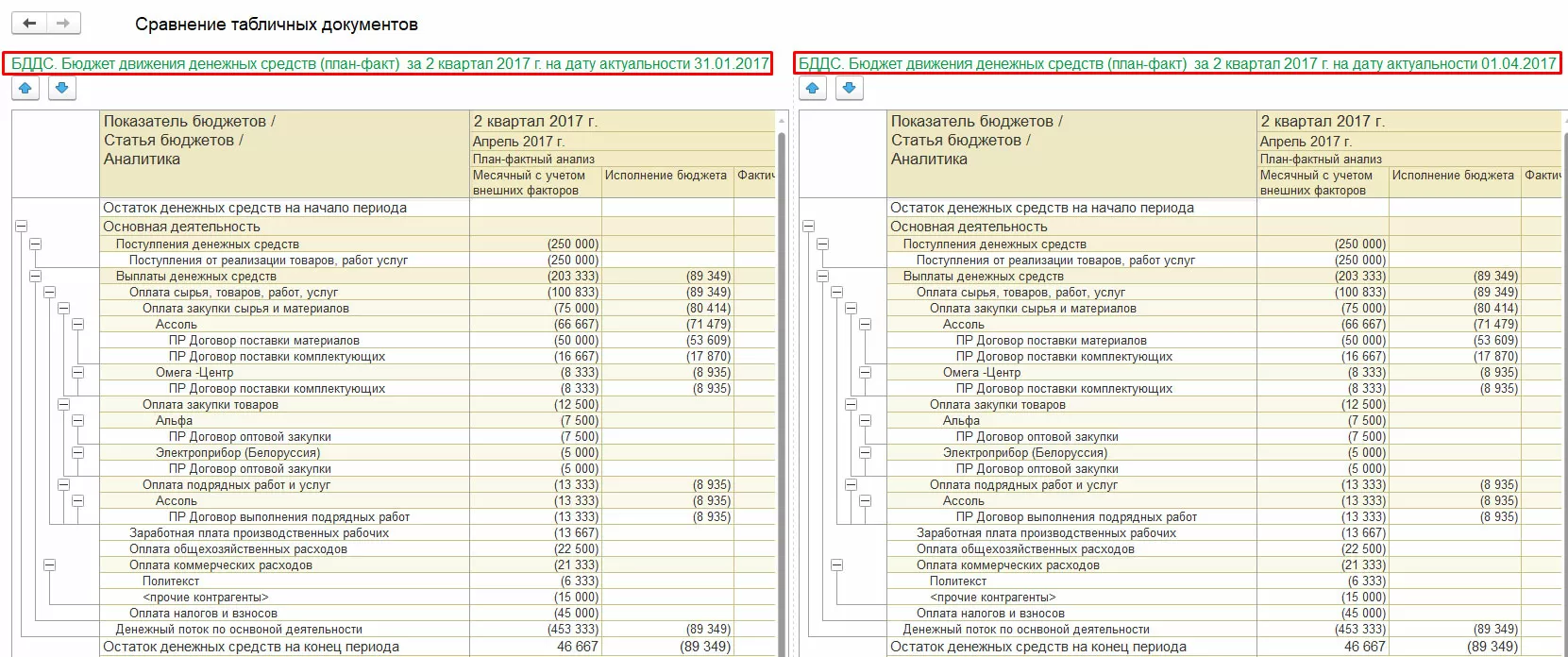 Например, мы в январе ввели «Экземпляр бюджета» по виду бюджета БДДС на 2 квартал, а позже скорректировали его. Формирование отчета с выбором настройки «Сравнение по датам актуальности» позволяет сравнить оба варианта.