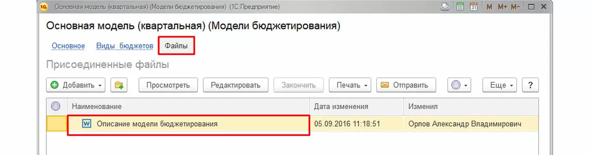 Бюджетная модель в виде файла может быть присоединена к элементу справочника.