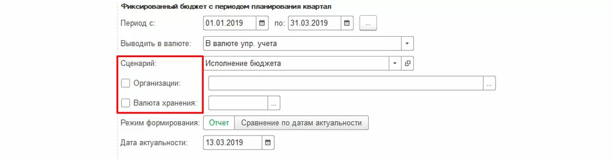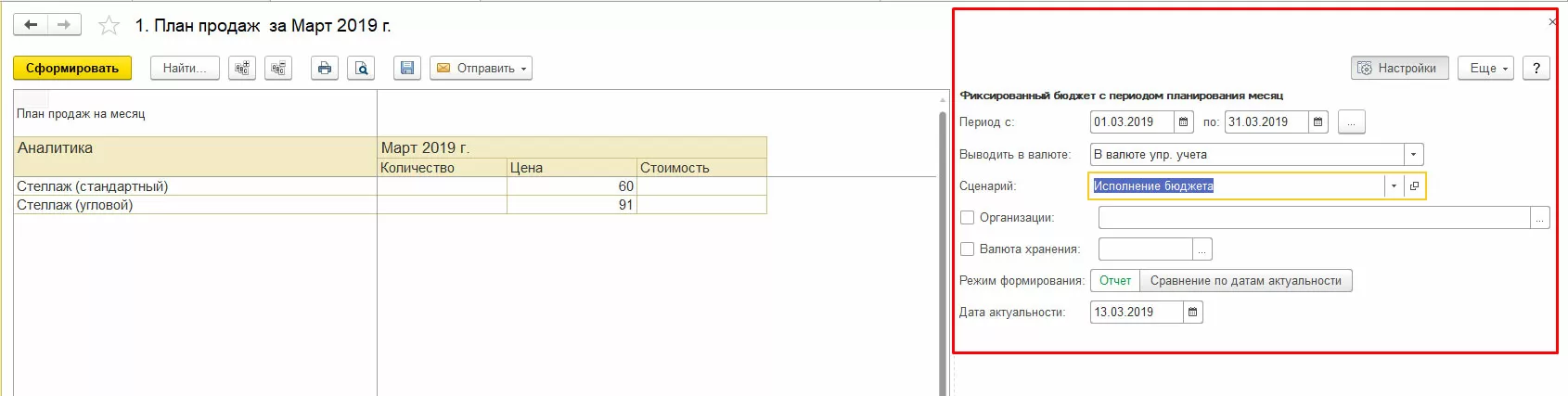 Если в «Виде бюджета» не указан сценарий, подразделение или организация, в отчете такие отборы можно указать в панели настроек отчета.