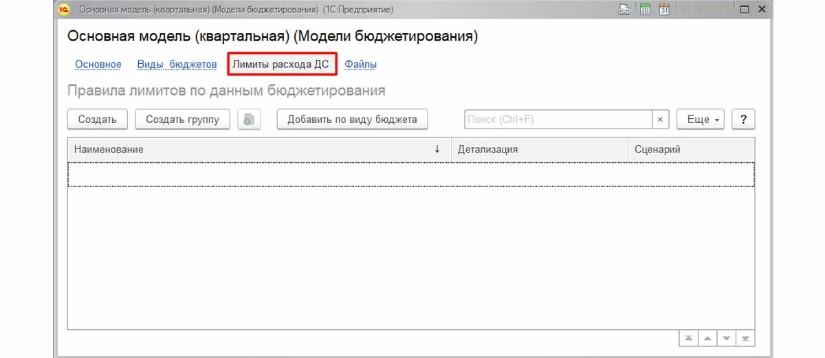 Модель бюджетирования может определять систему контроля расходования ДС. Лимиты расхода ДС задаются в справочнике «Правило лимитов по данным бюджетирования».
