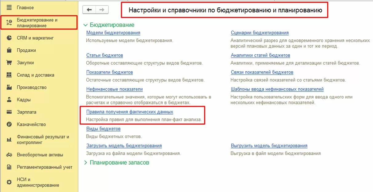 В подразделе «Настройки и справочники» раздела «Бюджетирование и планирование» имеется рабочее место «Правила получения фактических данных».