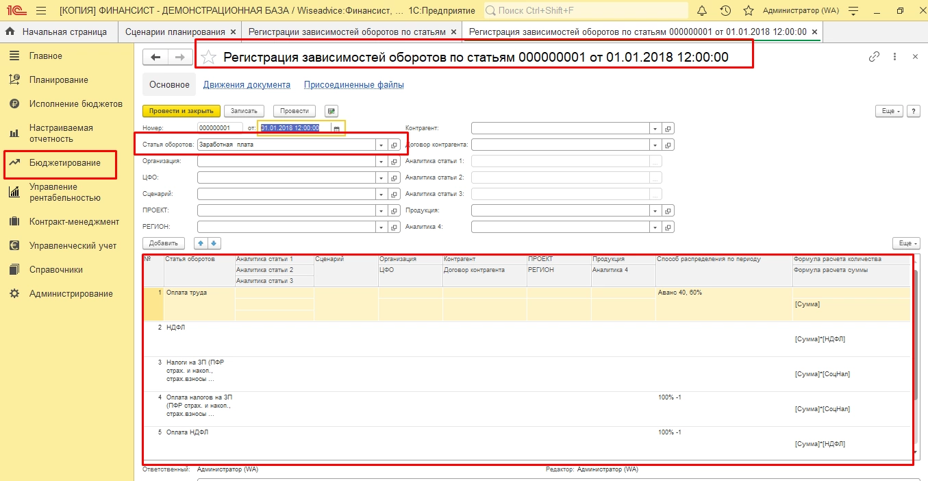Автоматизация бюджетирования в крупных компаниях на базе 1С:Управление холдингомВ программе WA:Финансист для планирования данных предусмотрен документ «Регистрация зависимостей оборотов по статьям бюджетов», где можно формировать зависимые друг от друга статьи оборотов в разных временных периодах. Здесь же можно указывать формулы расчета, при помощи которых будет рассчитана зависимая статья. Планирование зависимой статьи можно сдвинуть в периоде в зависимости от поставленной задачи при планировании.