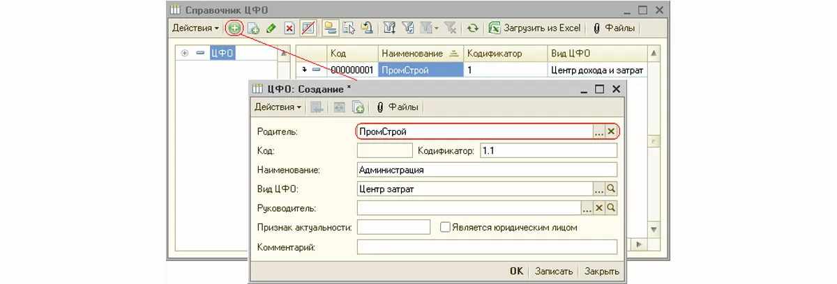 - Открыть меню «Справочники» - «Справочник ЦФО»;