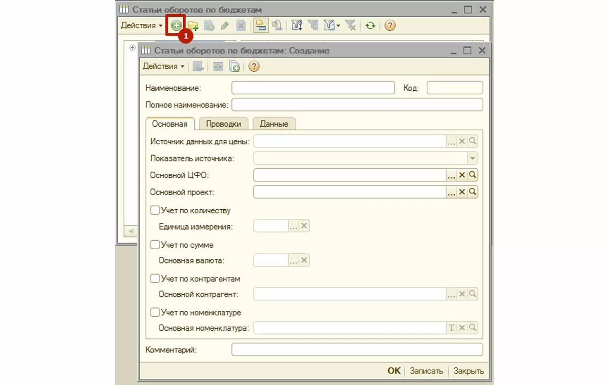 Для создания статей оборотов нужно использовать функцию «Добавить», ввести наименование статьи оборотов и заполнить характеристики в соответствии с правилами учета принятыми в финансовом департаменте. Подробнее о назначении полей и настройке проводок мы расскажем в следующей статье.
