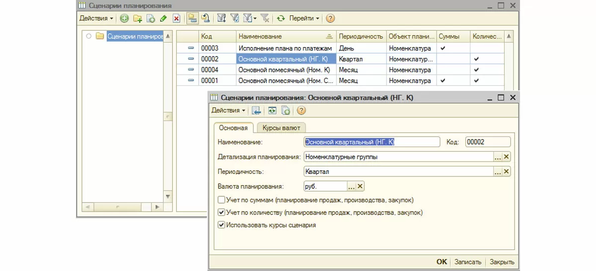 Настройка производится в Справочнике «Сценарии планирования» в соответствии с бизнес-требованиями пользователей.