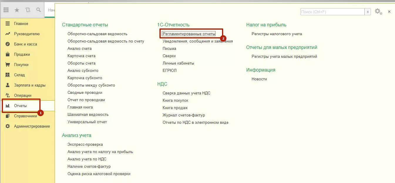 1. В пользовательском интерфейсе бухгалтера перейти на вкладку «Отчеты» и выбрать «Регламентированные отчеты».