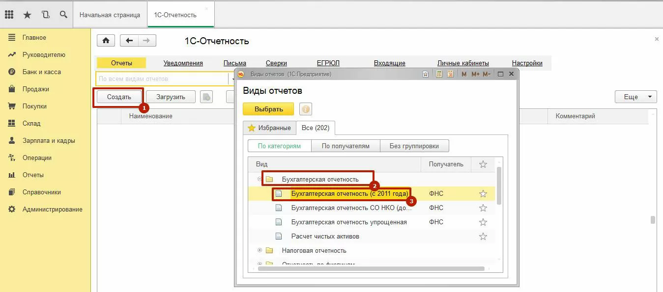 2. Нажатие «Создать» откроет перечень всех доступных форм отчетов. Для формирования нашего баланса необходимо раскрыть блок «Бухгалтерская отчетность» и в нем раздел «Бухгалтерская отчетность (с 2011 года)».