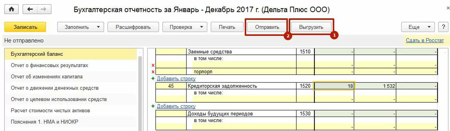 Для выгрузки отчета в файл нажмите кнопку «Выгрузить». Для передачи отчета через Интернет, нажмите кнопку «Отправить».