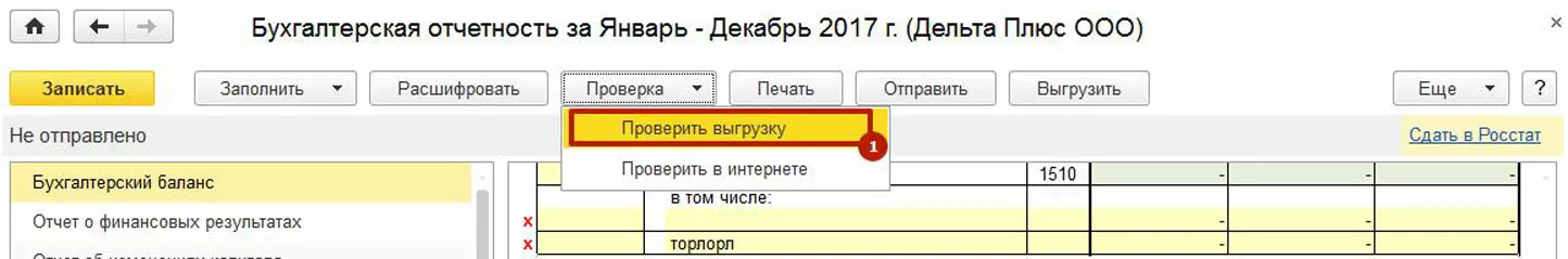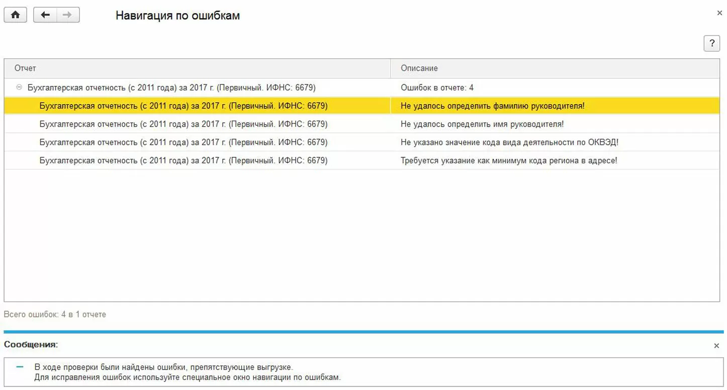 12. После формирования отчета и внесения необходимых корректировок запустите процедуру проверки. Для этого воспользуйтесь кнопкой «Проверка»/«Проверить выгрузку». 1С автоматически проверит все настройки и параметры отчета и отобразит в новом окне перечень ошибок, которые необходимо исправить перед отправкой отчета в налоговые органы.