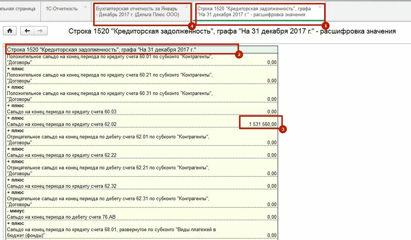 9. Расшифровка данных откроется в новом окне. При этом всегда можно вернуться к отчету «Бухгалтерский баланс», переключившись на соответствующую вкладку.