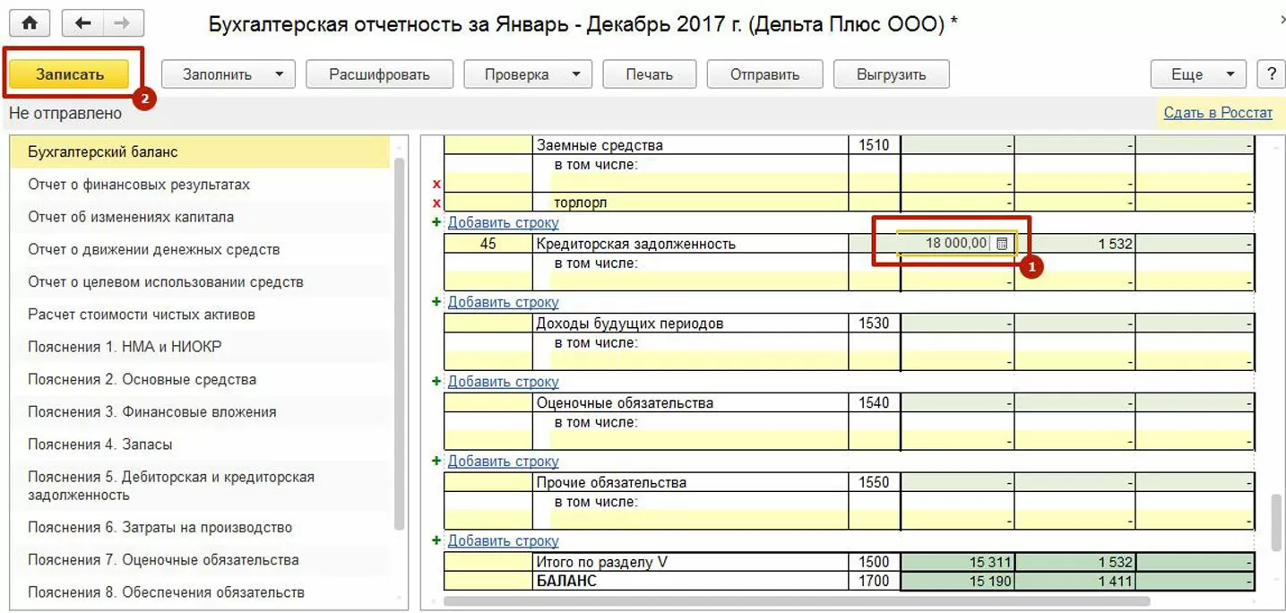 11. И когда мы только формируем наш баланс, и в процессе его корректировки, чтобы не потерять изменения рекомендуется регулярно сохранять отчет, используя кнопку «Записать».