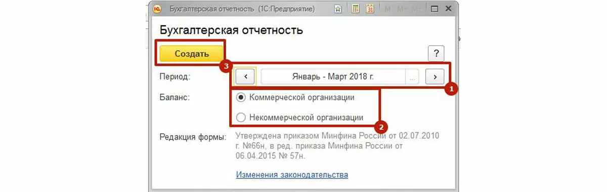 3. Выбор этого раздела приведет к открытию нового окна, где нужно указать период подготовки отчетности, выбрать тип организации – коммерческая или некоммерческая. Далее – «Создать».