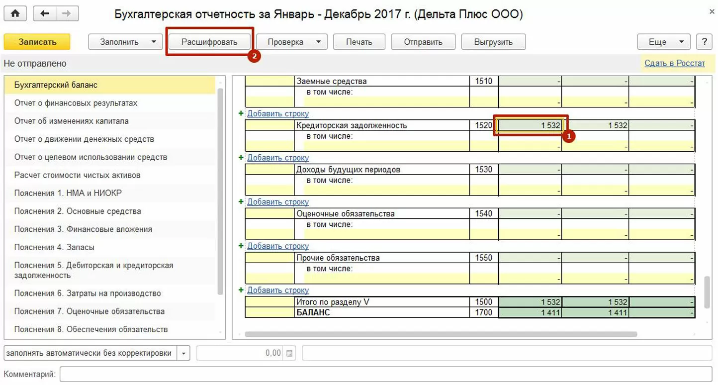 8. По каждому значению в отчете можно получить расшифровку и узнать, какие операции и документы были учтены при расчете данной суммы. Для этого выделите интересующее вас значение в отчете и нажмите кнопку «Расшифровать».