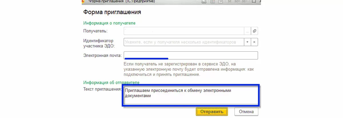 Нажмите кнопку «Отправить приглашение», чтобы 1С послала уведомление внешней компании. В открывшейся форме заполните электронную почту и напишите сообщение, чтобы получатель понял, что от него хотят.