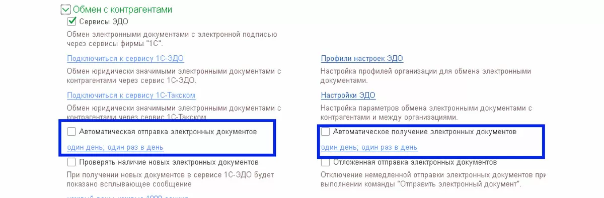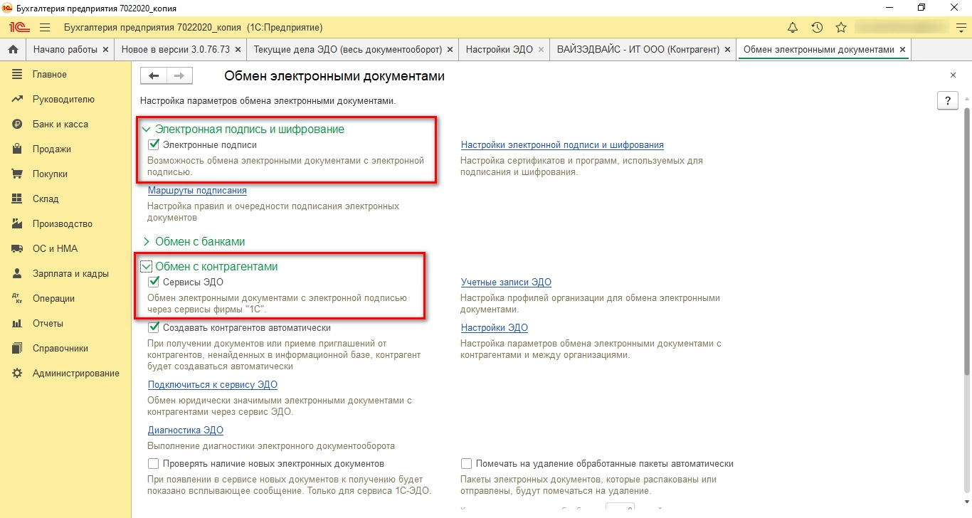 Открыв меню «Администрирование», нажимаем «Обмен электронными документами» и ставим отметки: