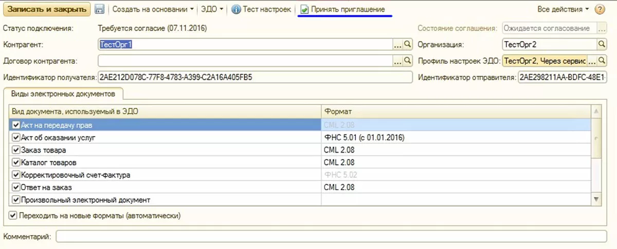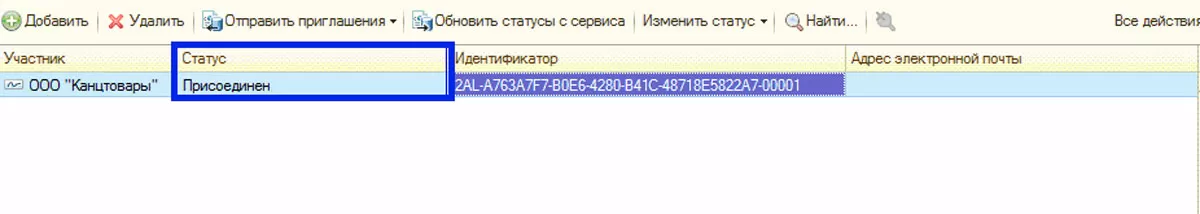 Когда контрагент примет приглашение, статус соглашения поменяется на «Присоединен». На этом настройка ЭДО в программе 1С для контрагента завершена. Также и контрагенты могут присылать вам приглашения для обмена данными.