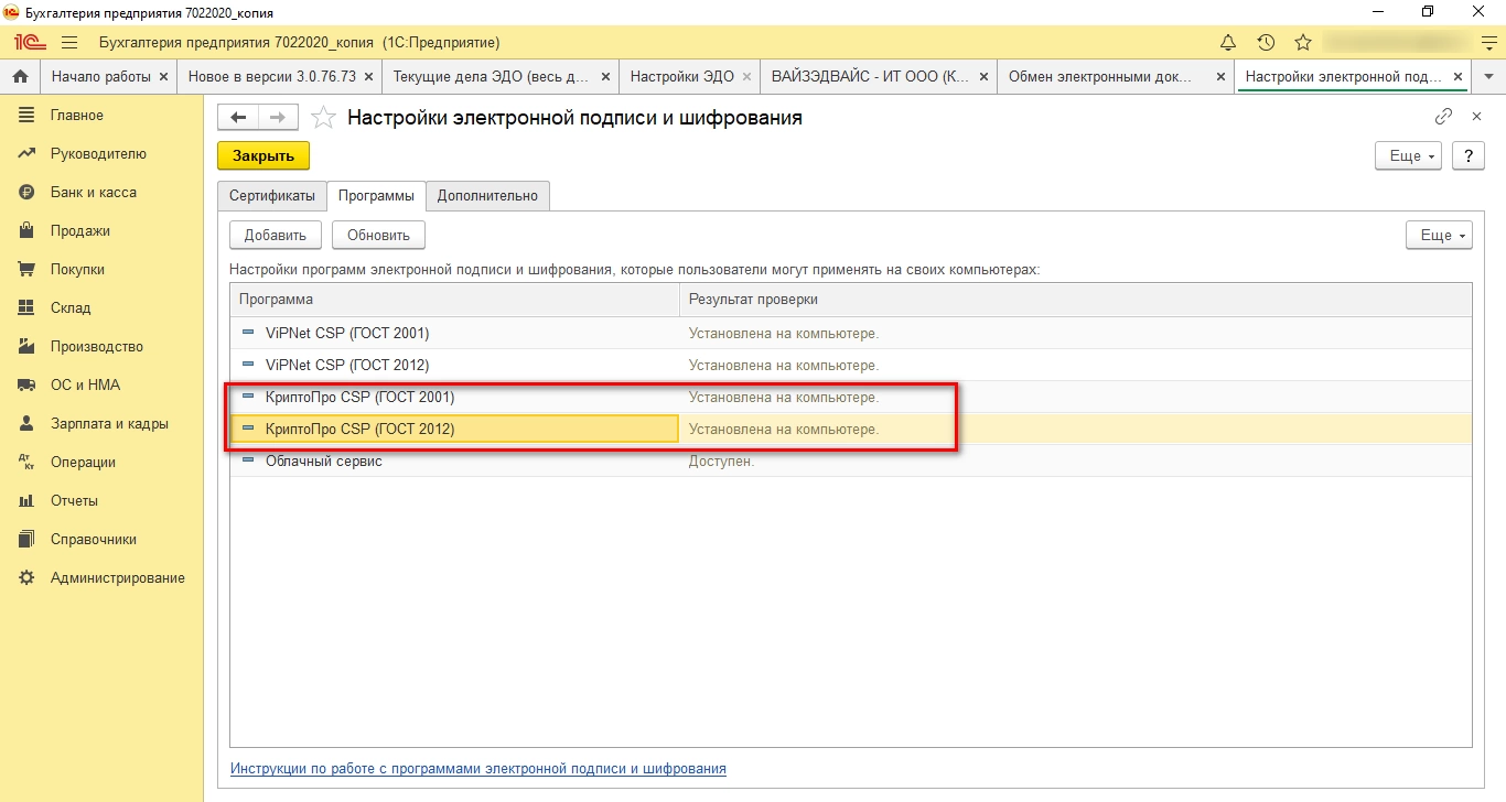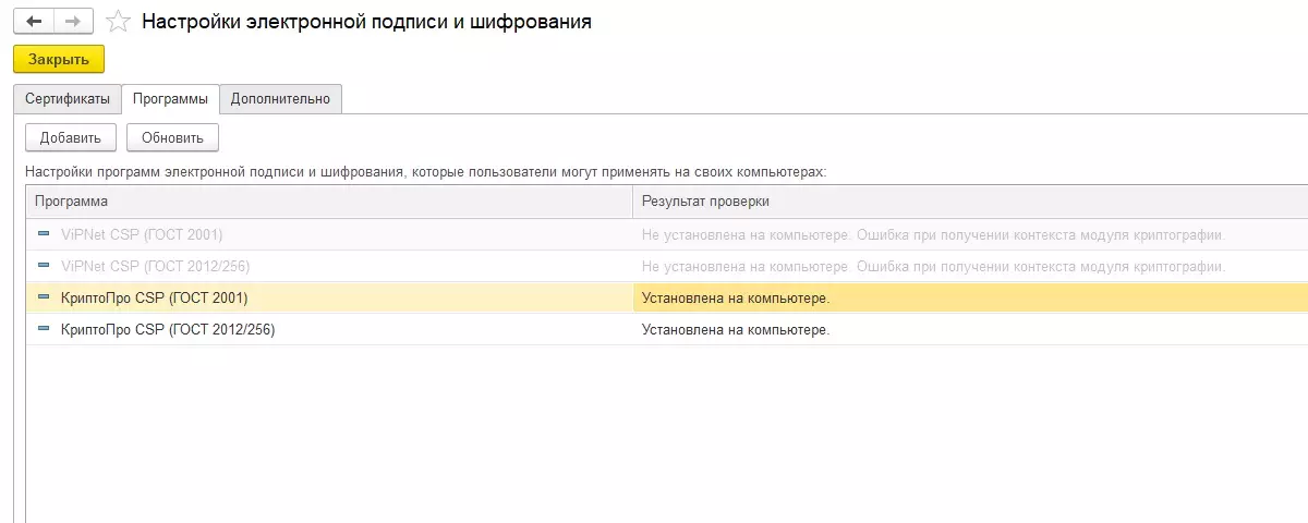 На закладке «Программы» вы можете проверить, что у вас установлена программа-криптопровайдер для взаимодействия с сертификатами и электронной подписью. Если на компьютере установлено ПО для шифрования КриптоПро (CryptoPro), то необходимо перейти на вкладку «Программы». Удостоверьтесь, что программа 1С нашла нужное ПО на ПК, а также что отсутствуют ошибки.
