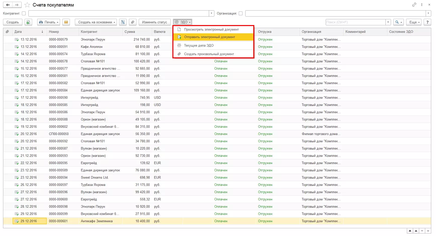 Отправить документ в электронном виде можно из любого списка документов в любой программе на платформе «1С:Предприятие». Если у вас включен обмен данными через ЭДО, установлены электронные подписи, то в списке появится пункт меню «ЭДО», который позволяет начать обмен.
