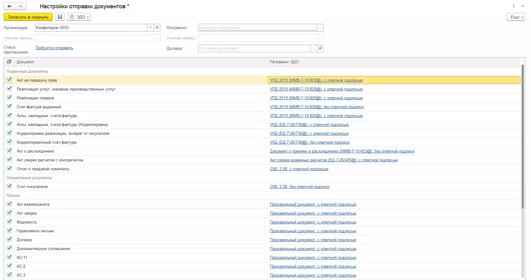 Вы можете настроить формат отправляемых документов, например, одним из стандартов передачи данных реализации, поступлении товаров, а также сопутствующих документов – является формат УПД 2019 (формат универсального передаточного документа).