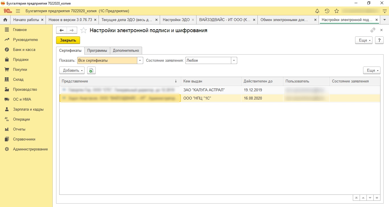 Кнопка открытия формы «Настройки электронной подписи и шифрования» активизируется. Переходим внутрь и нажимаем комбинацию «Добавить»-«Из установленных на ПК», чтобы выбрать настроенный сертификат. Выбираем сертификат для подписи из перечня, обнаруженного системой 1С.